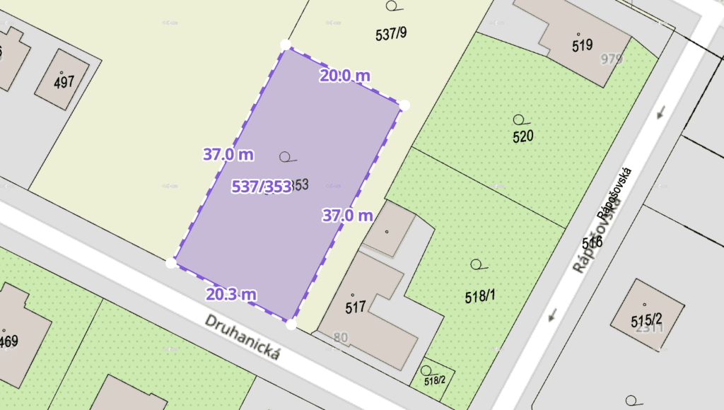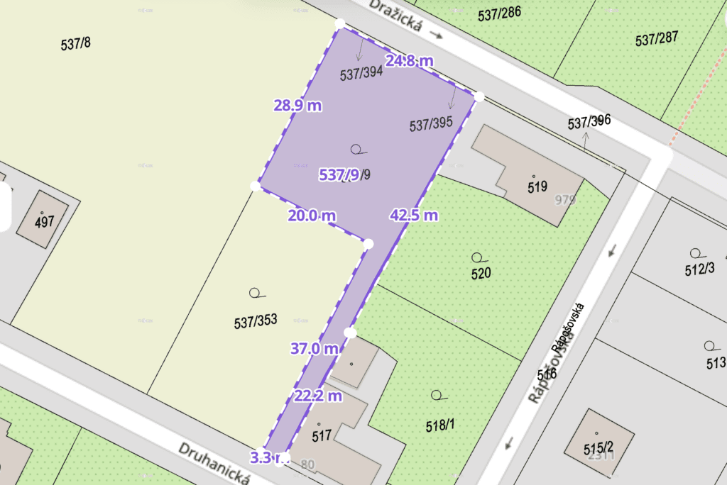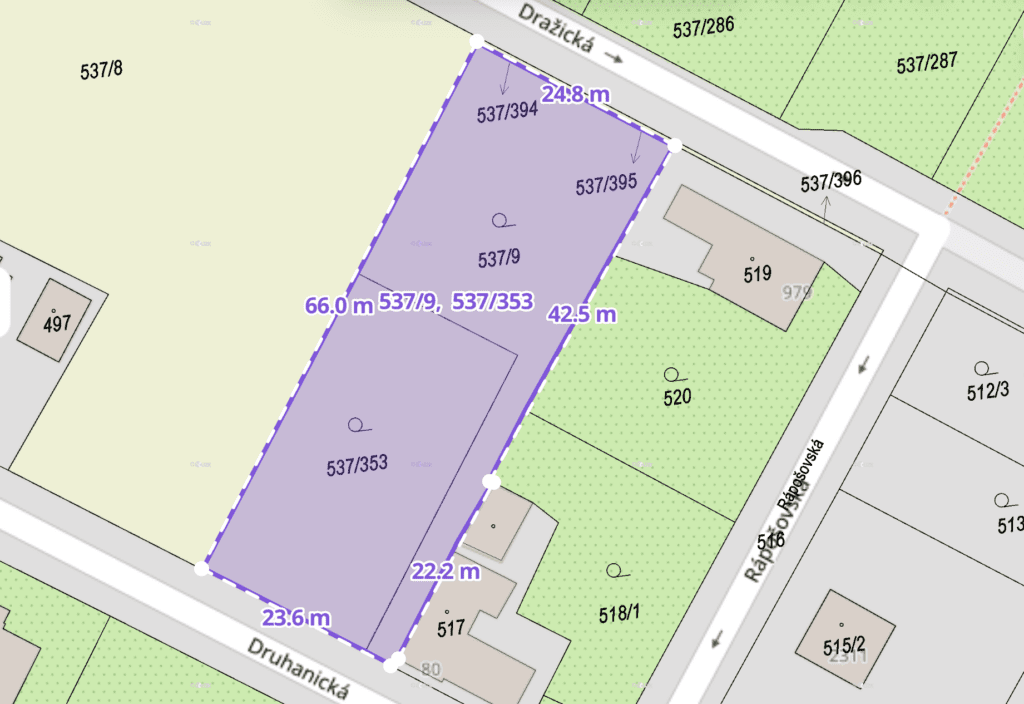 Pozemky jsou svou rozlohou ideální pro stavbu prostorného rodinného domu a díky rovinatému povrchu jsou připraveny i na případné další úpravy. Inženýrské sítě jsou na dosah – pozemky mají přístup k vodovodu, elektřině (230V, 400V), plynu, veřejné kanalizaci, telekomunikacím i kabelovým rozvodům, což výrazně usnadní přípravy pro stavbu. Přístup na pozemky je zatím pouze z ulice Druhanická a možnost dalšího přístupu z ulice Dražická je na osobním jednání, což by do budoucna mohlo zvýšit jejich hodnotu i využití.